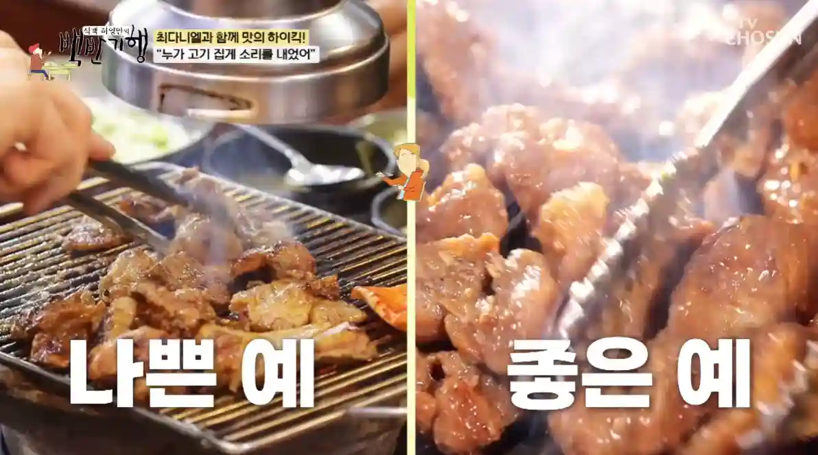 돼지갈비 굽는 팁으로는 볶음 요리를 하듯이 고기를 굴려가며 굽는 게 팁이라고 합니다.