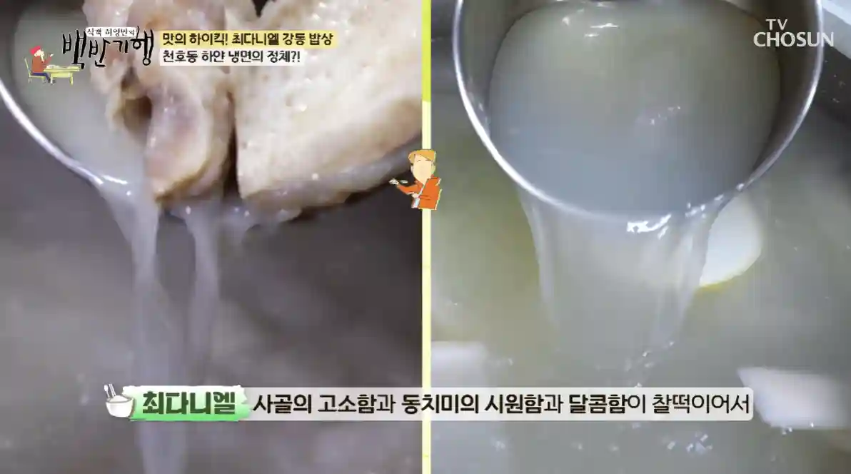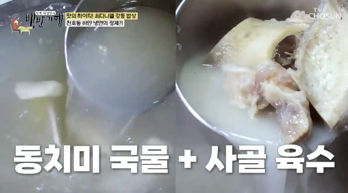 이곳 서울 강동구 열무냉면은 다른 집과 다른 냉면육수를 사용한다고 하는데요. 바로 통치미 국물과 사골 육수를 섞어서 하얀 냉면 육수를 만든 다고 합니다.